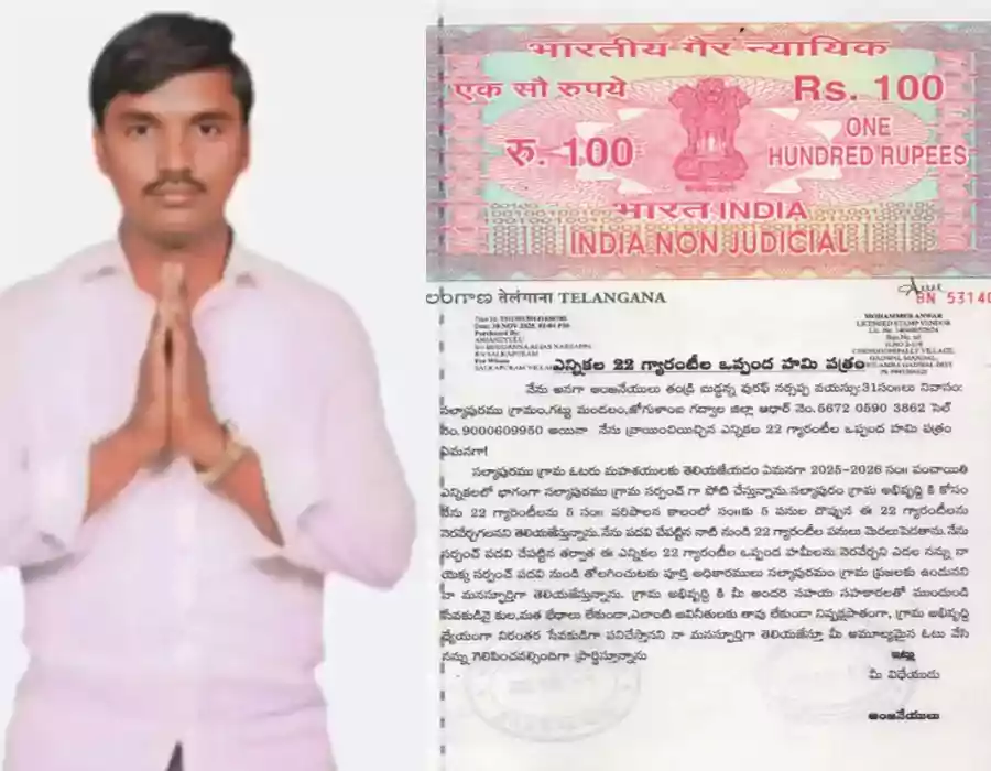 జోగులాంబ గద్వాల జిల్లా గట్టు మండలం సల్కాపురం గ్రామ సర్పంచ్ అయ్యేందుకు ఏకంగా బాండ్ పేపర్ పట్టుకొని తిరుగుతున్నాడు. తనను ఎన్నుకుంటే ఏకంగా గ్రామ అభివృద్ధి, సంక్షేమం కోసం 22హామీలతో బాండ్ రెడి చేసి.. ప్రచారం చేస్తున్నారు. తనను గెలిపిస్తే ప్రతి ఏడాది 5 చొప్పున పూర్తిగా 22 హామీలు అమలు చేస్తానని బాండ్ పేపర్ లో పేర్కొన్నాడు సర్పంచ్ అభ్యర్థి ఆంజనేయులు. లేని యెడల తనను సర్పంచ్ పదవి నుంచి తొలగించుటకు సల్కాపురం గ్రామస్థులకు పూర్తి అధికారం ఉంటుందని స్పష్టం చేశారు.